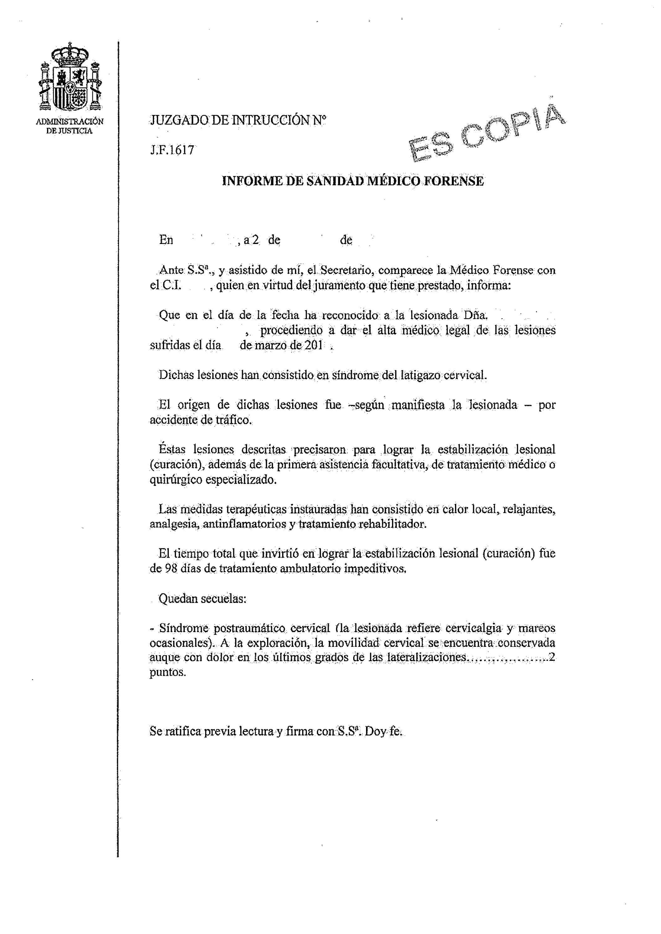Después, dice “Que dichas lesiones han consistido en latigazo cervical”. ( esto lo extrae el forense de la documentación médica que se le presenta, ellos nunca diagnostican si no que valoran según lo reflejado por los médicos que han tratado a la lesionada en este caso, por eso es tan importante acreditar bien mediante documentos, las lesiones padecidas y el tratamiento seguido). Manifiesta luego el origen de las lesiones “ accidente de tráfico”, puede ocurrir a veces que exista alguna lesión que no tenga que ver con el accidente de tráfico.